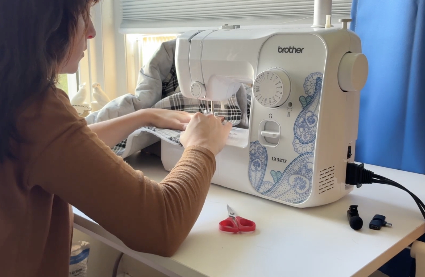 To add the batting between the two pieces of fabric I used batting glue. This blanket is huge at almost 6ft long and while sewing i need to make sure nothing shifts. Batting glue helps keep everything in place while I sew all of the layers together. My batting is a polyfill in a twin size. You can always use multiple pieces of batting glued together if you need. I wanted to sew horizontal and vertical lines to create the quilted look. It took me over 9 hours of sewing straight lines just to finish the length of the blanket. You can see the sewn lines better on the cloudy side then you can on the plaid. For that reason I wanted to do a more modern quilted design. I did every line for the length of the blanket but for the width I decided on groups of lines equally spaced to give a fun and fresh feeling.